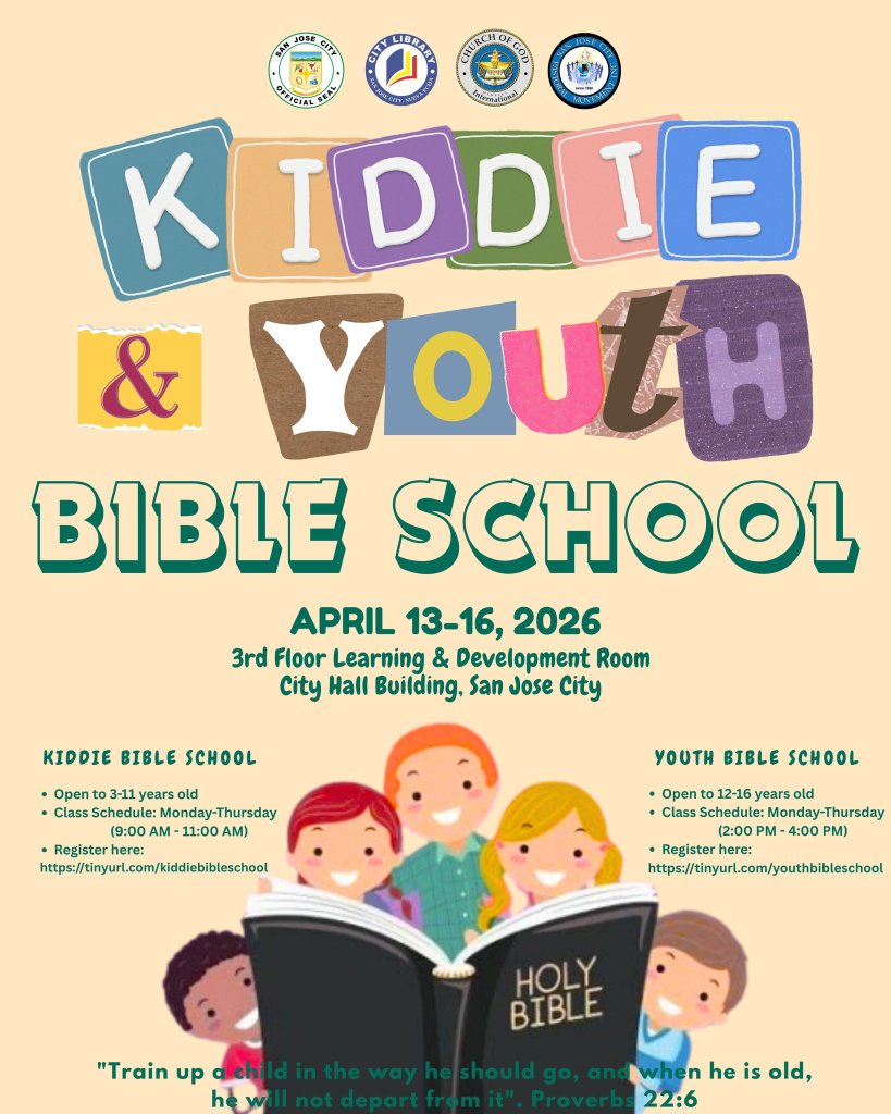If your family is Born Again Christian, the City Library offers a free four-day Kiddie and Youth Bible School from April 13 to 16, 2026. Classes will be held at the 3rd Floor of our City Hall.