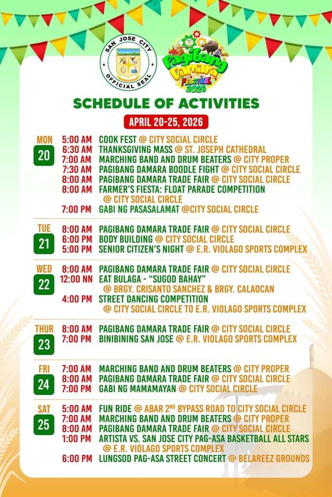 San Jose City LGU has just posted the schedule of activities for this year’s Pagibang Damara Festival. This is a great opportunity for your kids to learn more about our local history and culture.